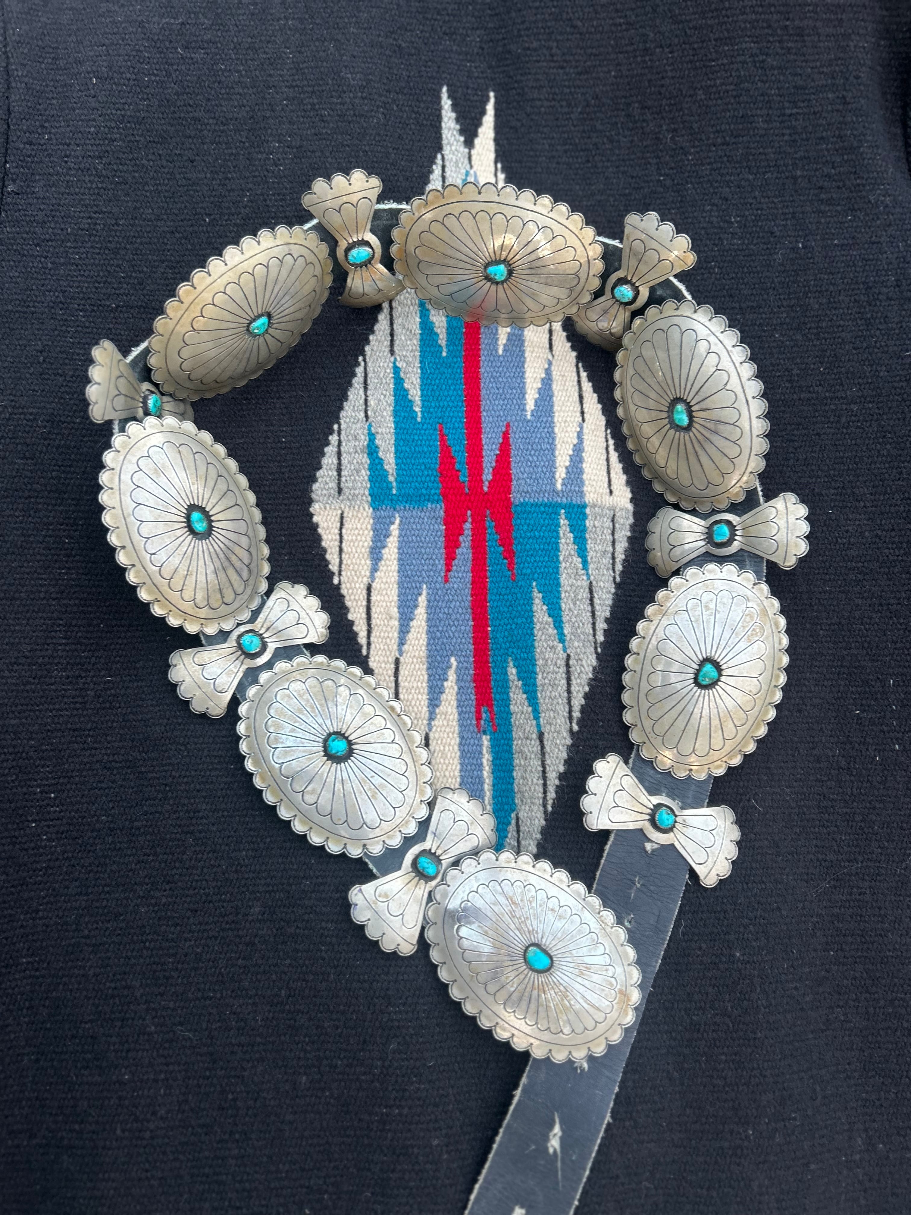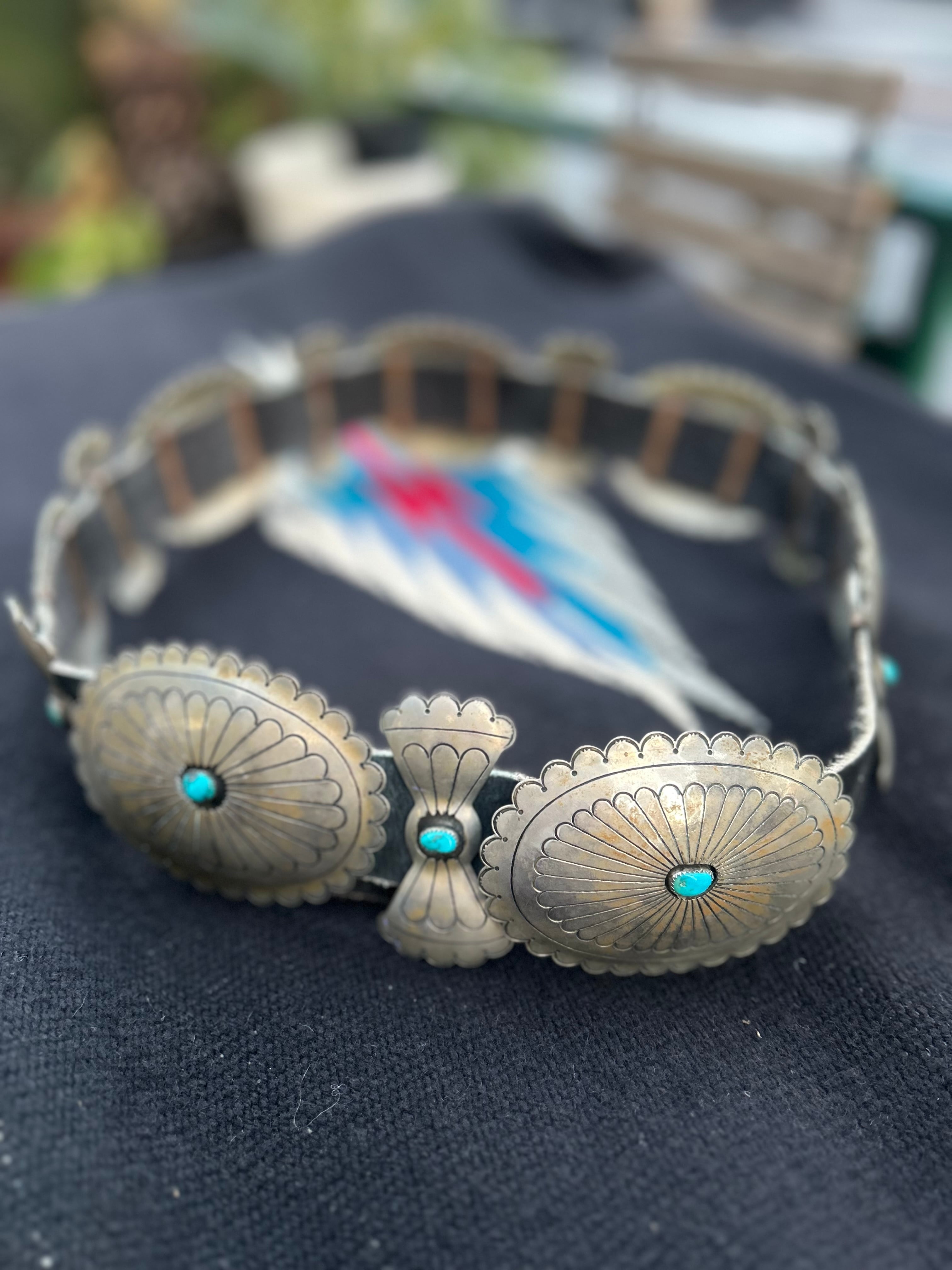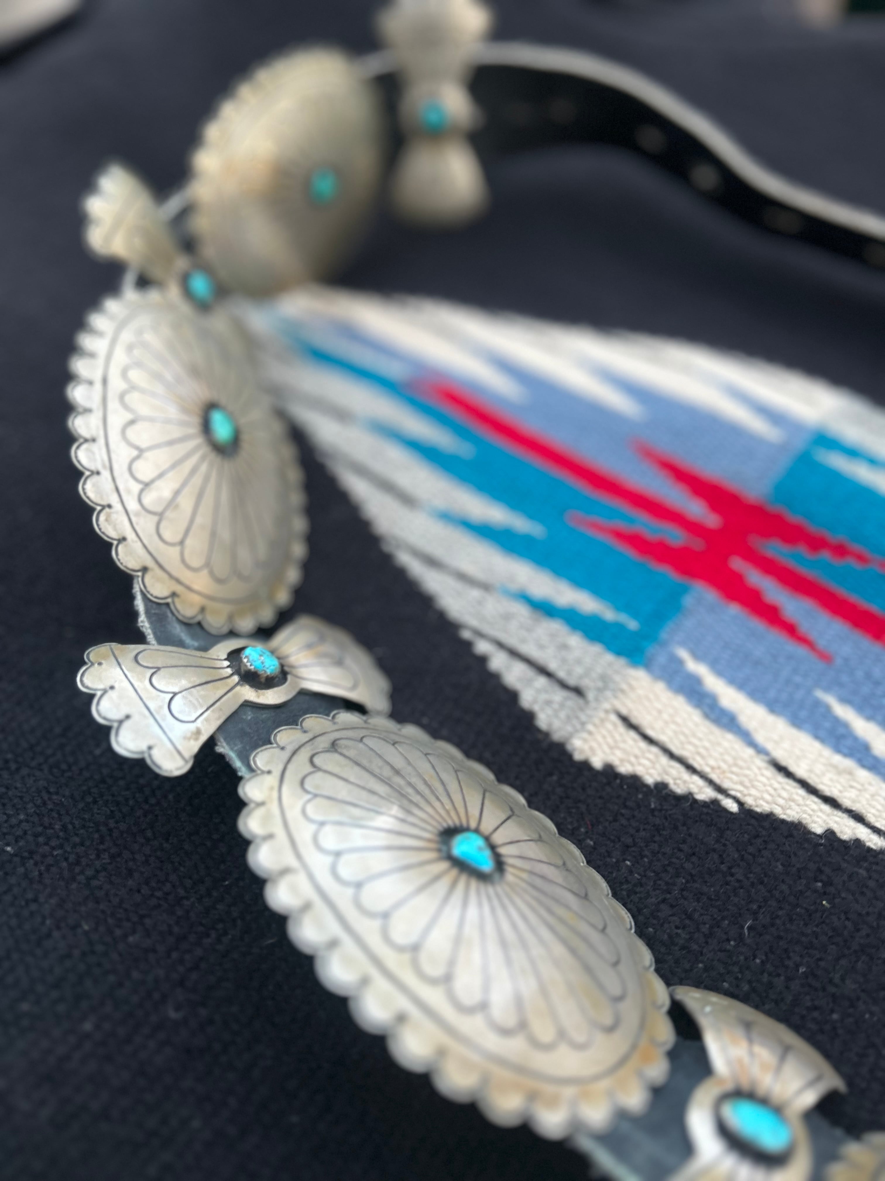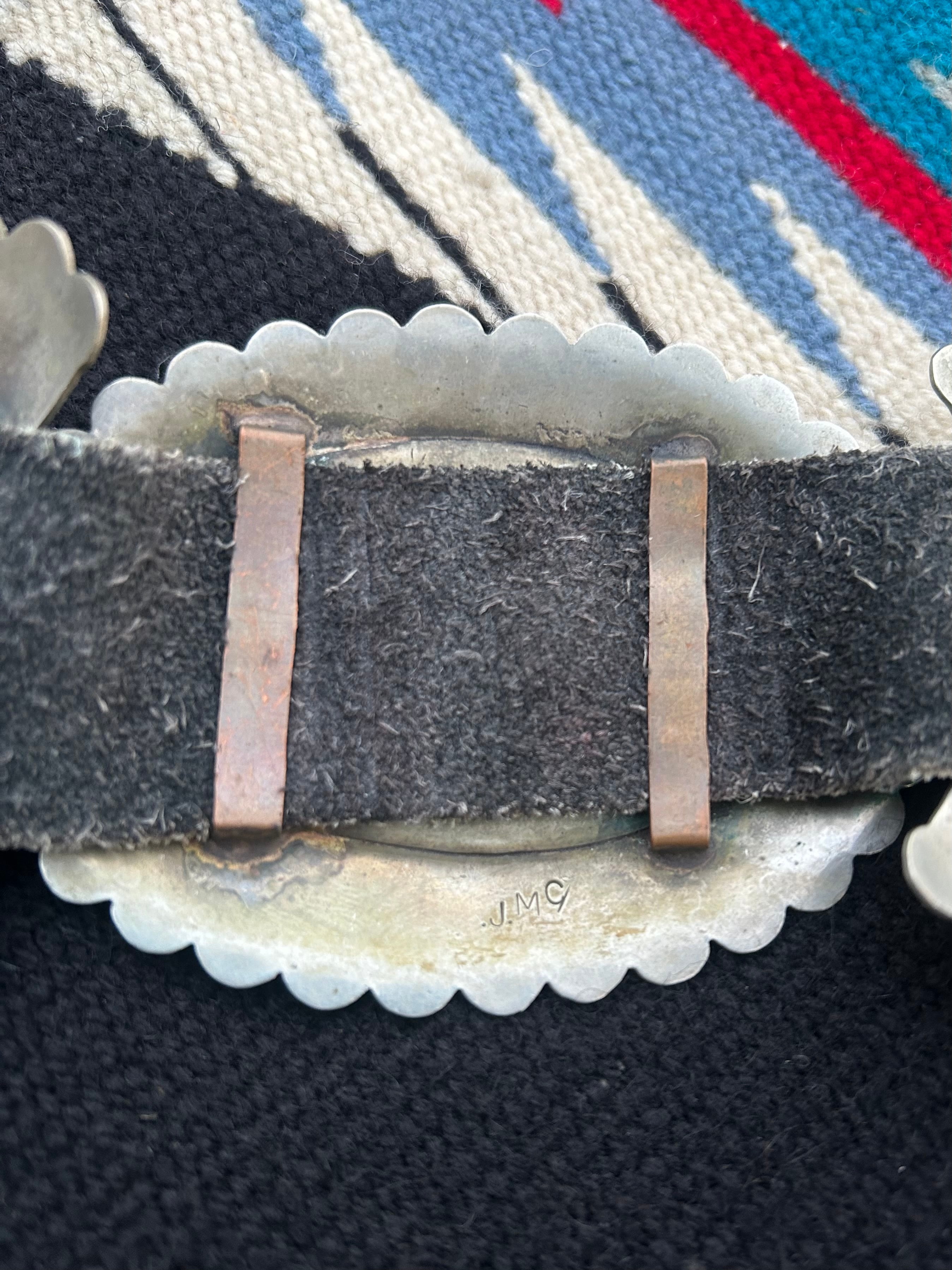 VINTAGE JMC(Jane Mc Rory)のヴィンテージコンチョベルト。 ヴィンテージシルバー特有の燻みや汚れ細かなキズなどございます。 サイズ 全長 120cm コンチョ10cm×7cm