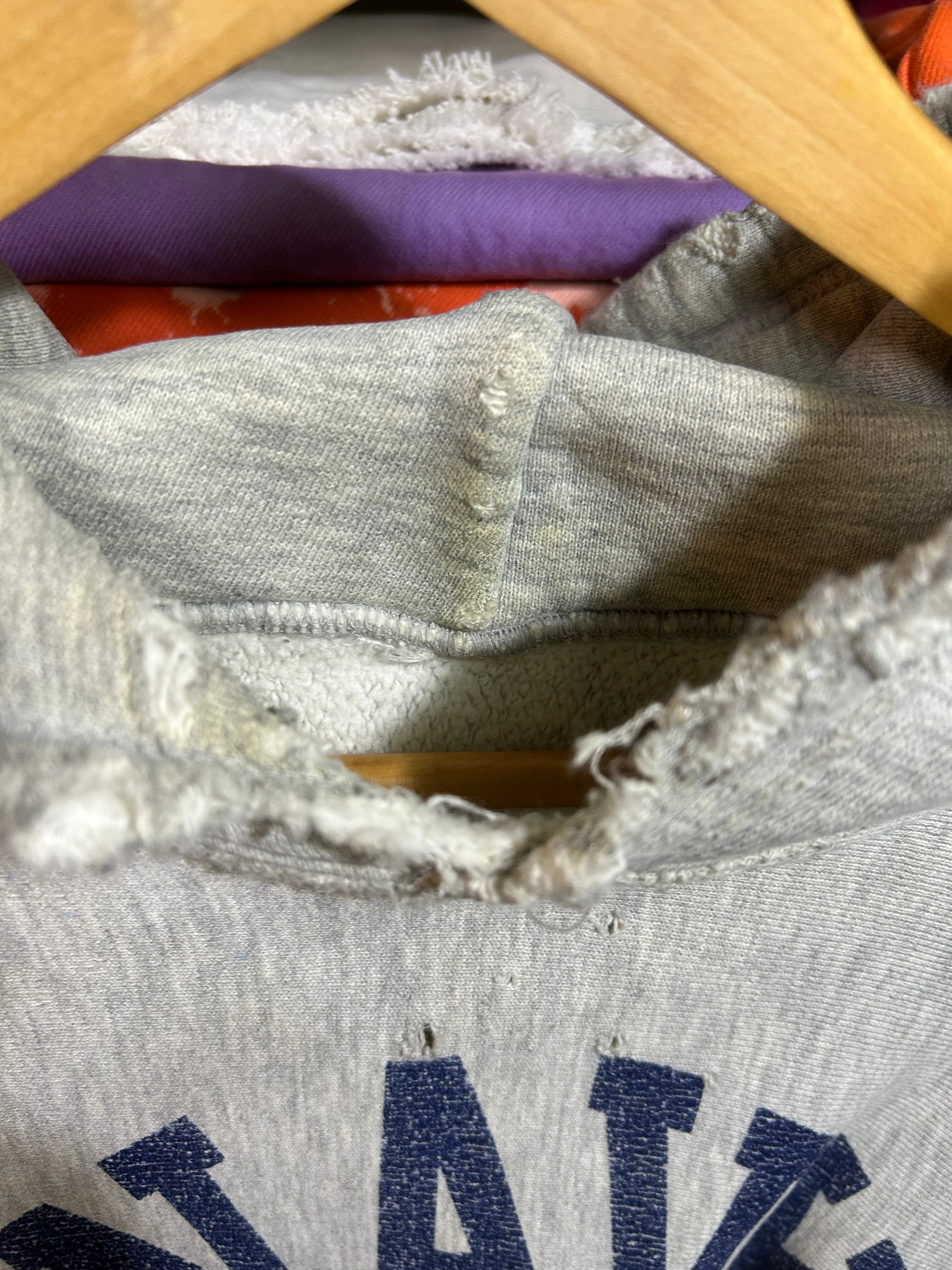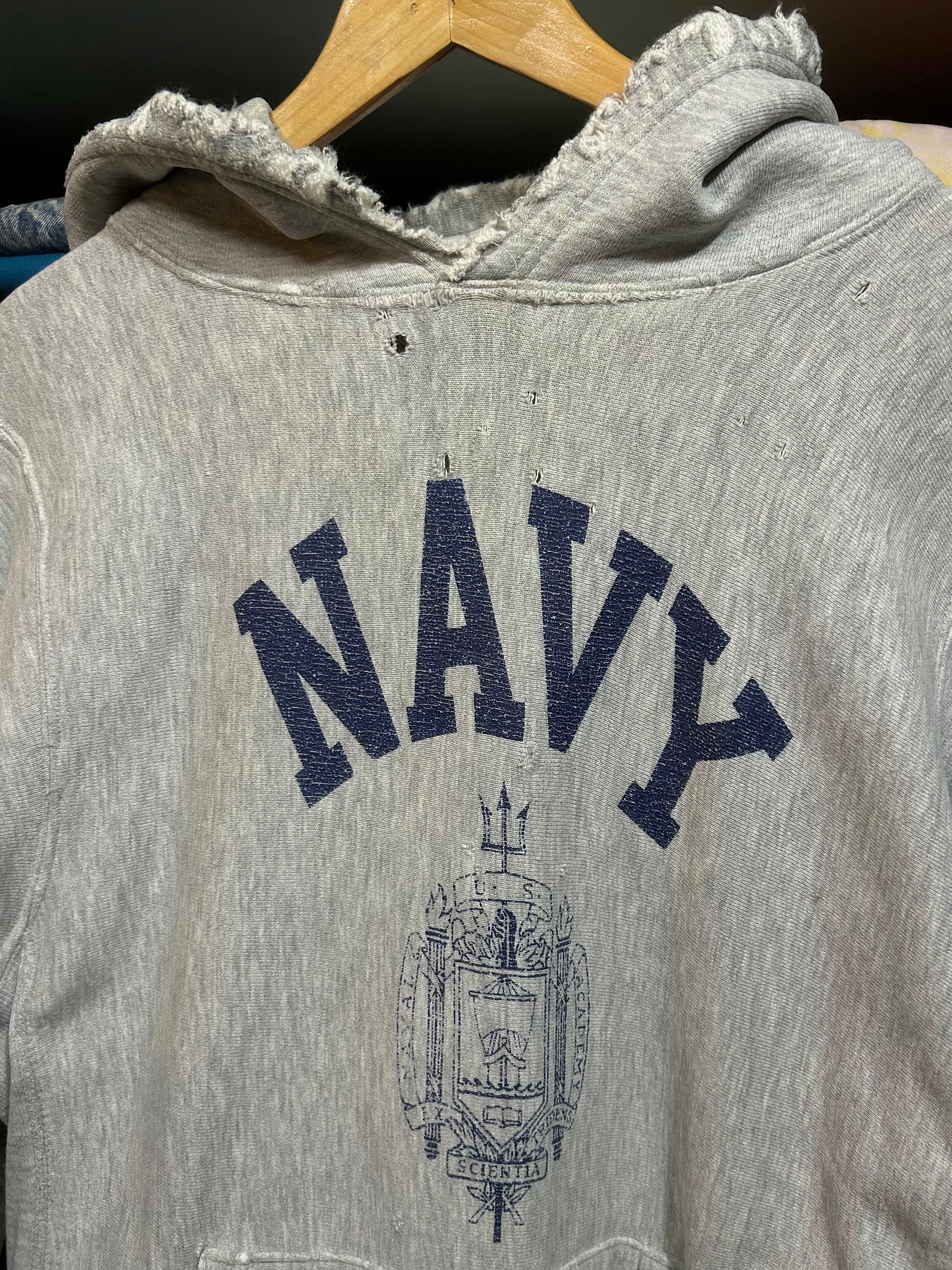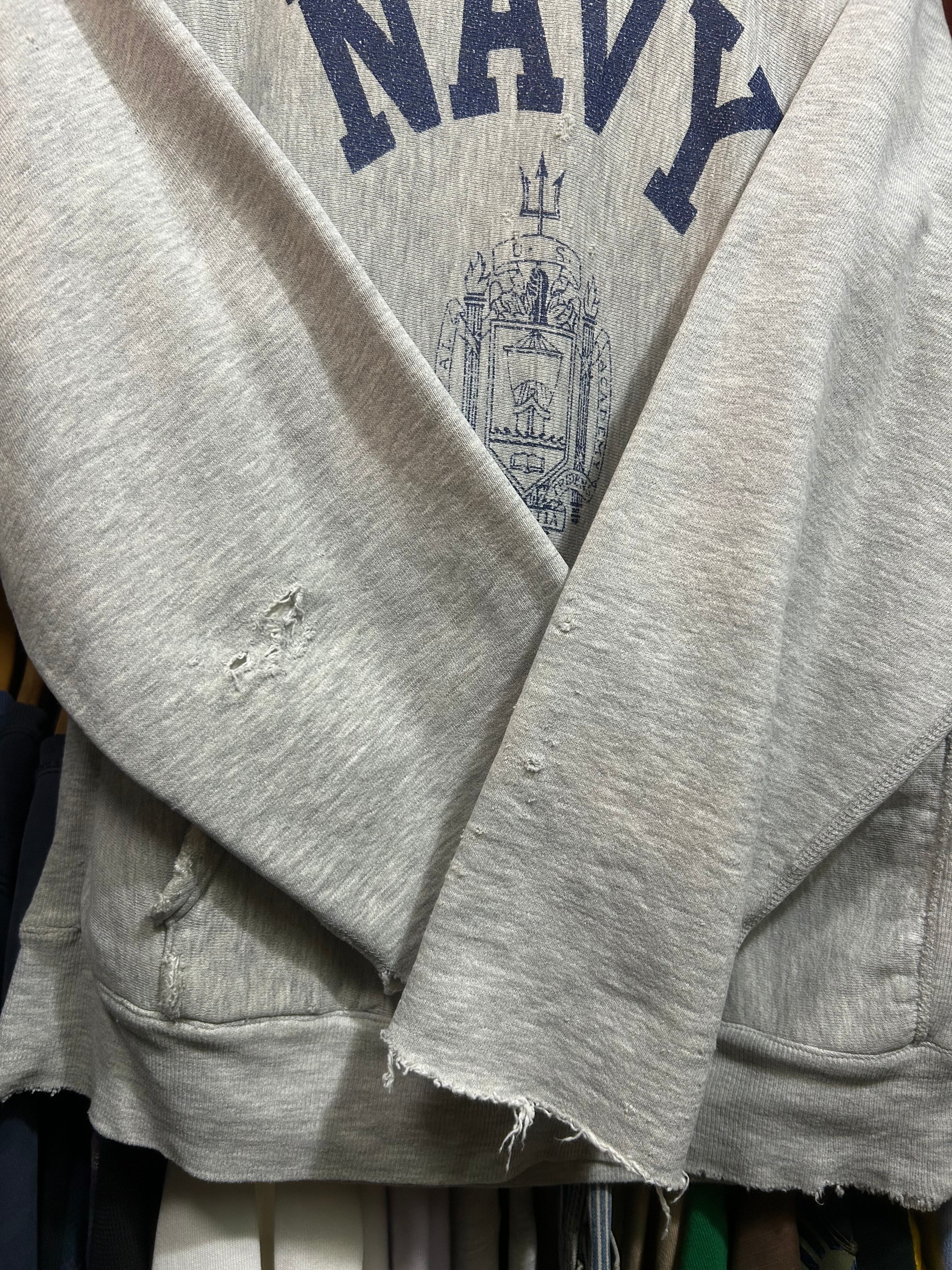 1980年代、U.S.NAVYのビンテージリバースウィーブパーカー。 カットオフ&ダメージありの雰囲気のある1着。 サイズ M相当 着丈62 肩幅49 身幅53