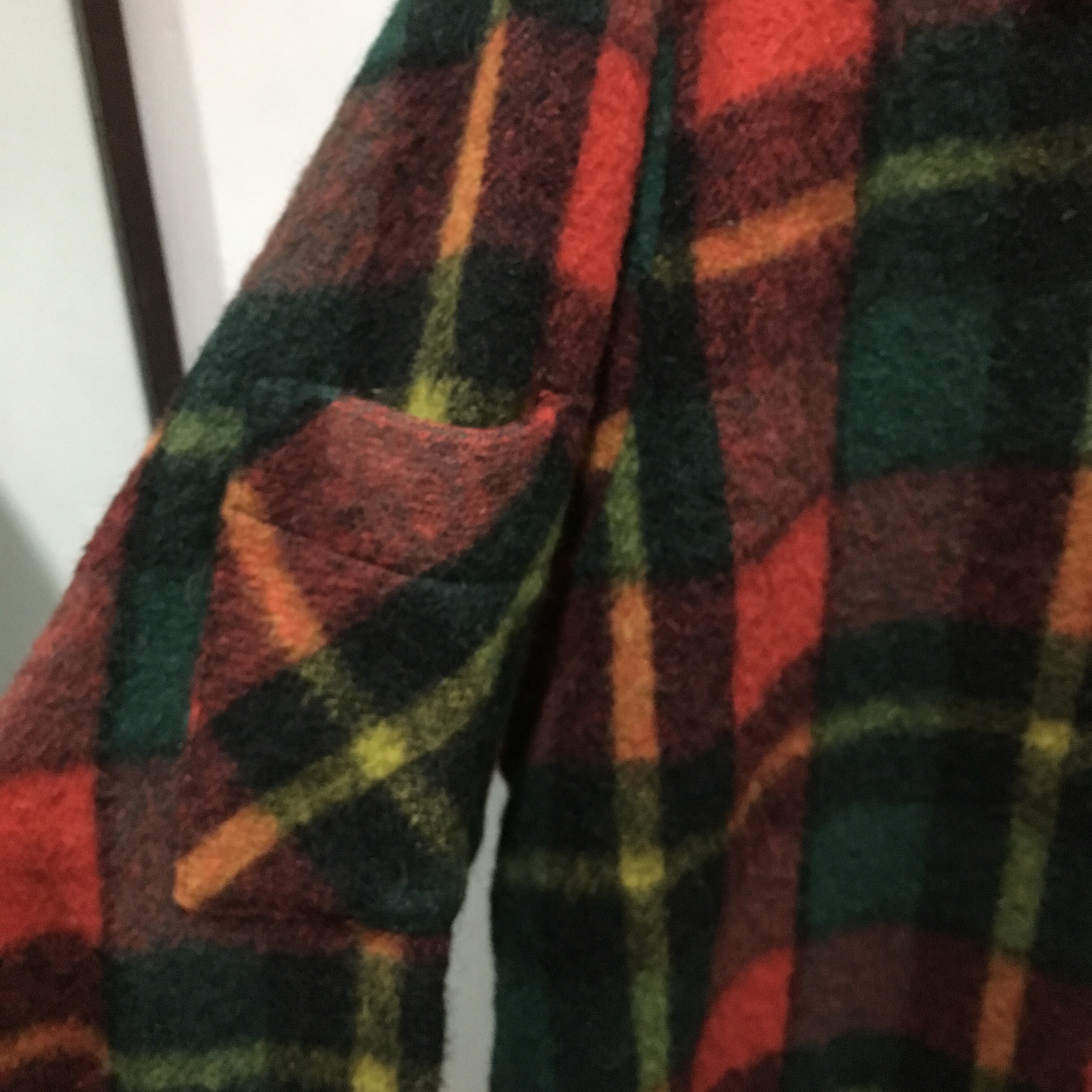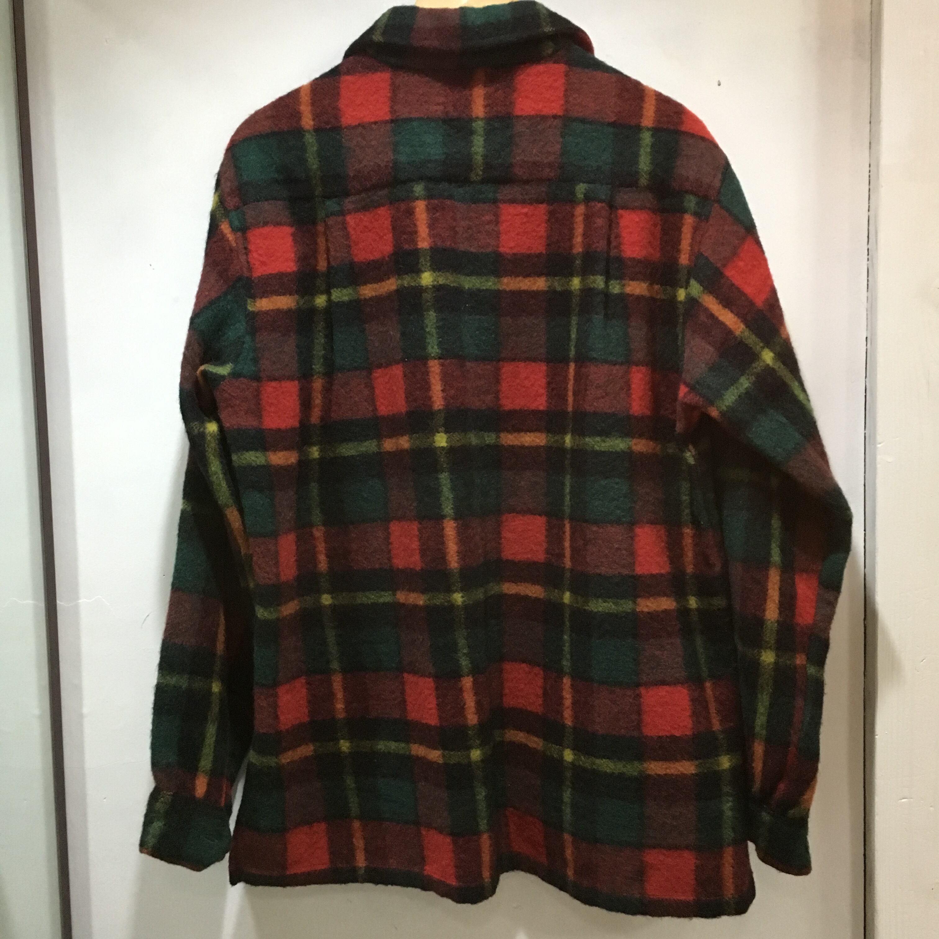 1960年代のピルグリム、ウールシャツです。 着丈の長いプルオーバーに、ポケットの数と珍しい形かと思います。 トップボタンか両サイドについているので、おそらく着脱式のフラップが付いていたようですが欠品しております。 他に欠品や目立った汚れもなくウールの状態もいいです。 身幅 約57cm 肩幅 約40cm 着丈 約79cm 袖丈 約64cm