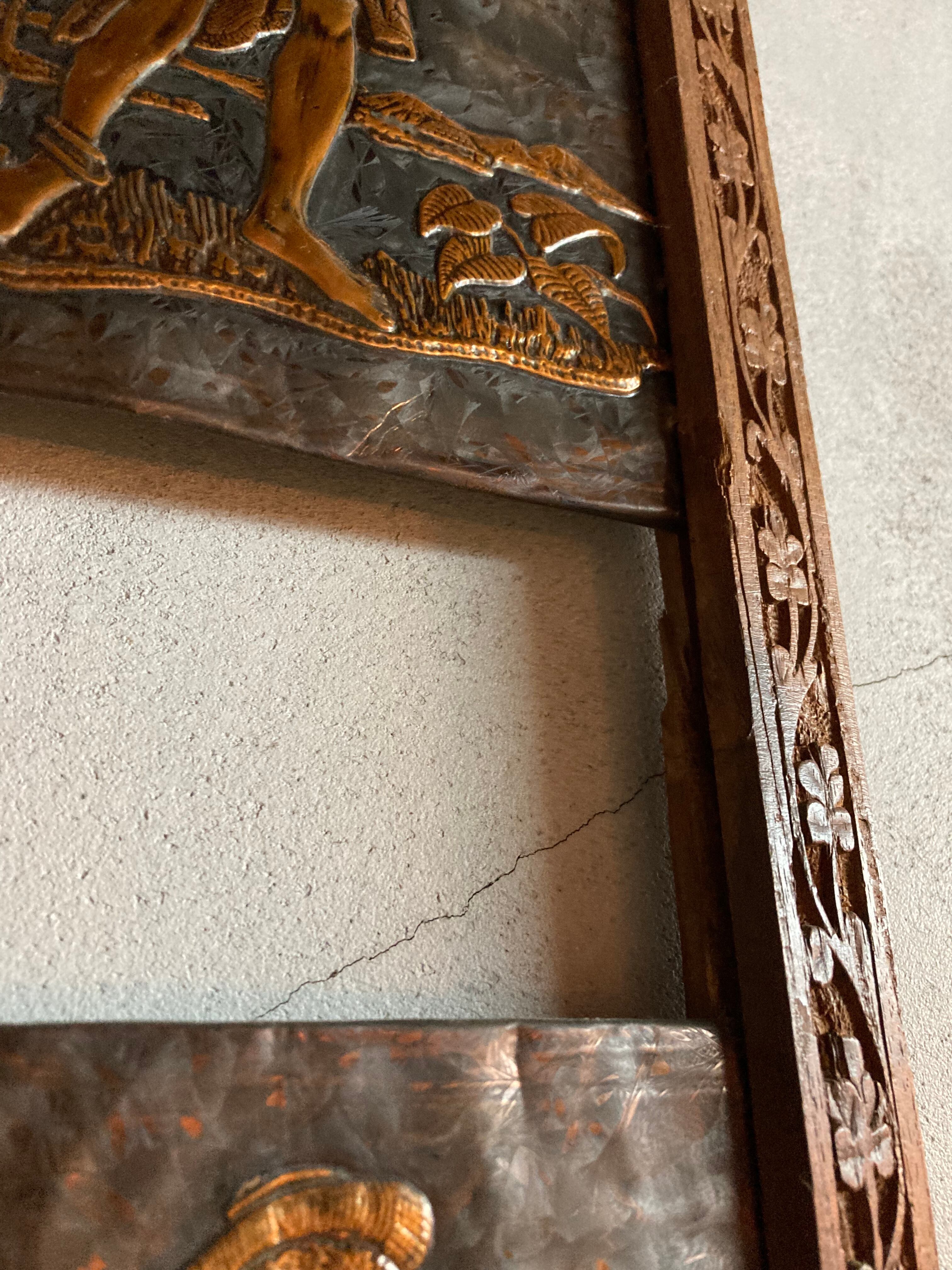 1950年代、南国ハワイアン&タヒチをイメージして作られた壁飾り。 手彫りのウッドフレームに銅板を型取りした当時のビンテージ品。 サイズ H510mm×W187mm×D30mm