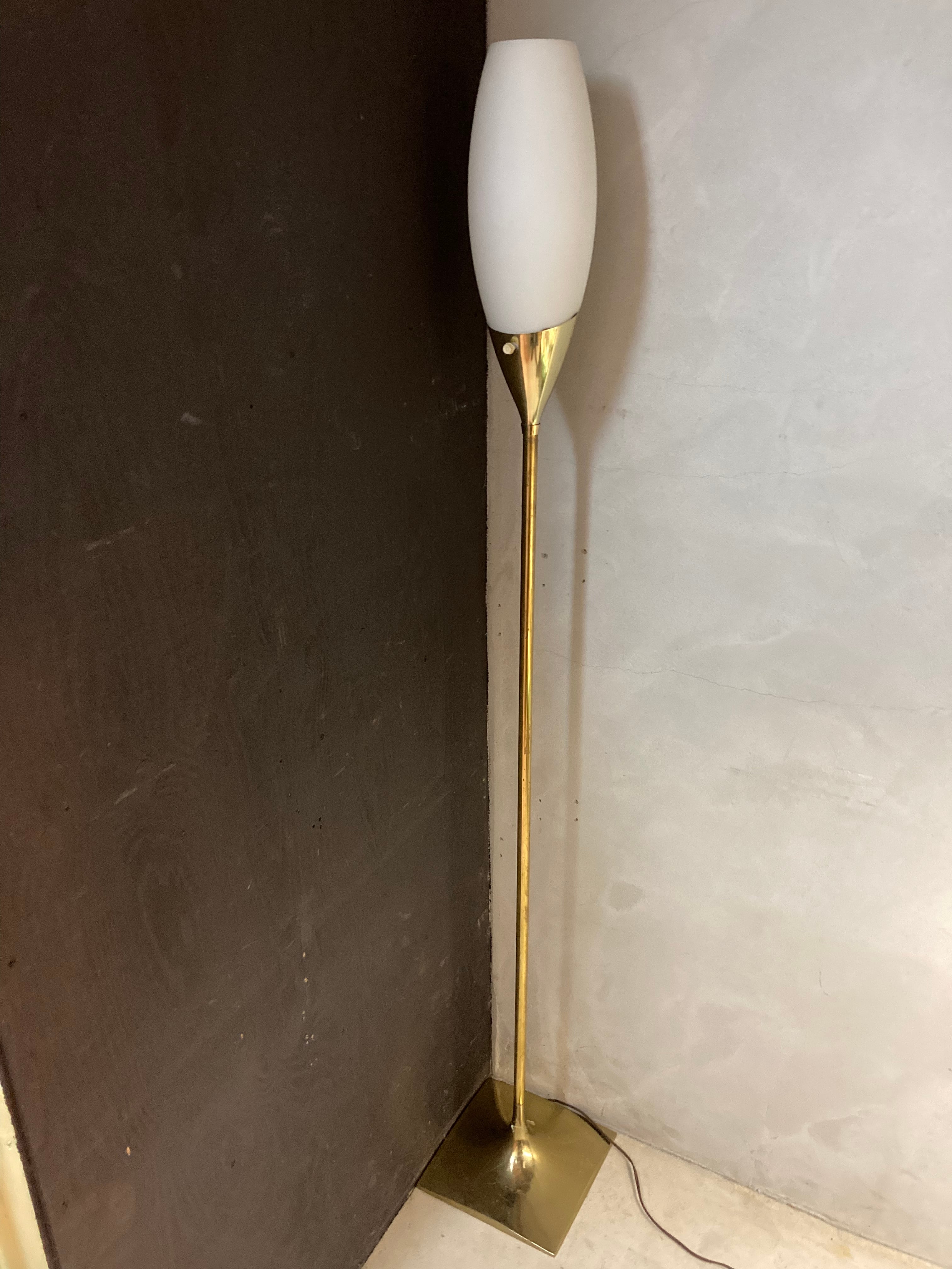 1960年代、デザイナー(Gerald Thurston)のビンテージフロアランプ。 真鍮ゴールドとガラスシェードの落ち着いたシンプルな組み合わせ、モダンで上品なデザイナーズフロアランプ。 サイズ H1685mm×W260mm×D260mm