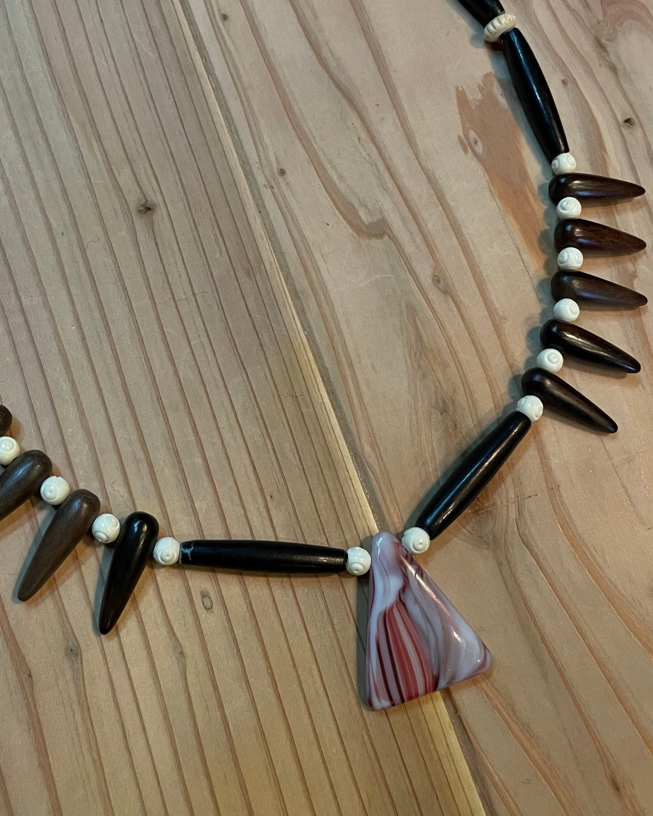 100年前のアンティークガラスビーズをペンダントトップ(赤茶)に、ボーンビーズとウッドビーズを混ぜ合わせたネイティブネックレス。